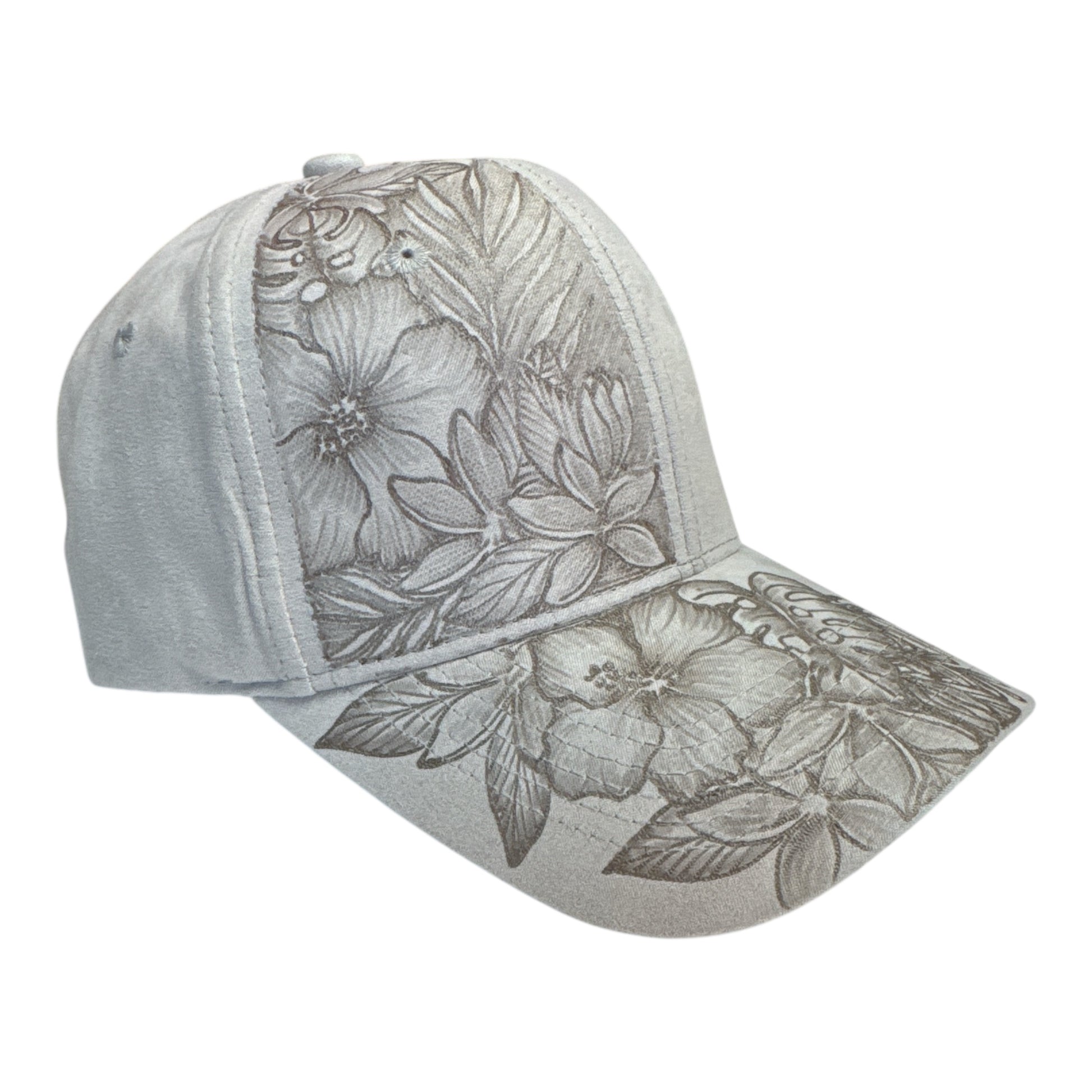 Expertly handcrafted, our Full Blooms - Burned Suede Baseball Cap features a beautiful combination of hibiscus, monstera, palms, and plumeria designs that are burned onto the suede using Pyrography techniques. With each piece being one-of-a-kind, this cap is sure to make a statement.