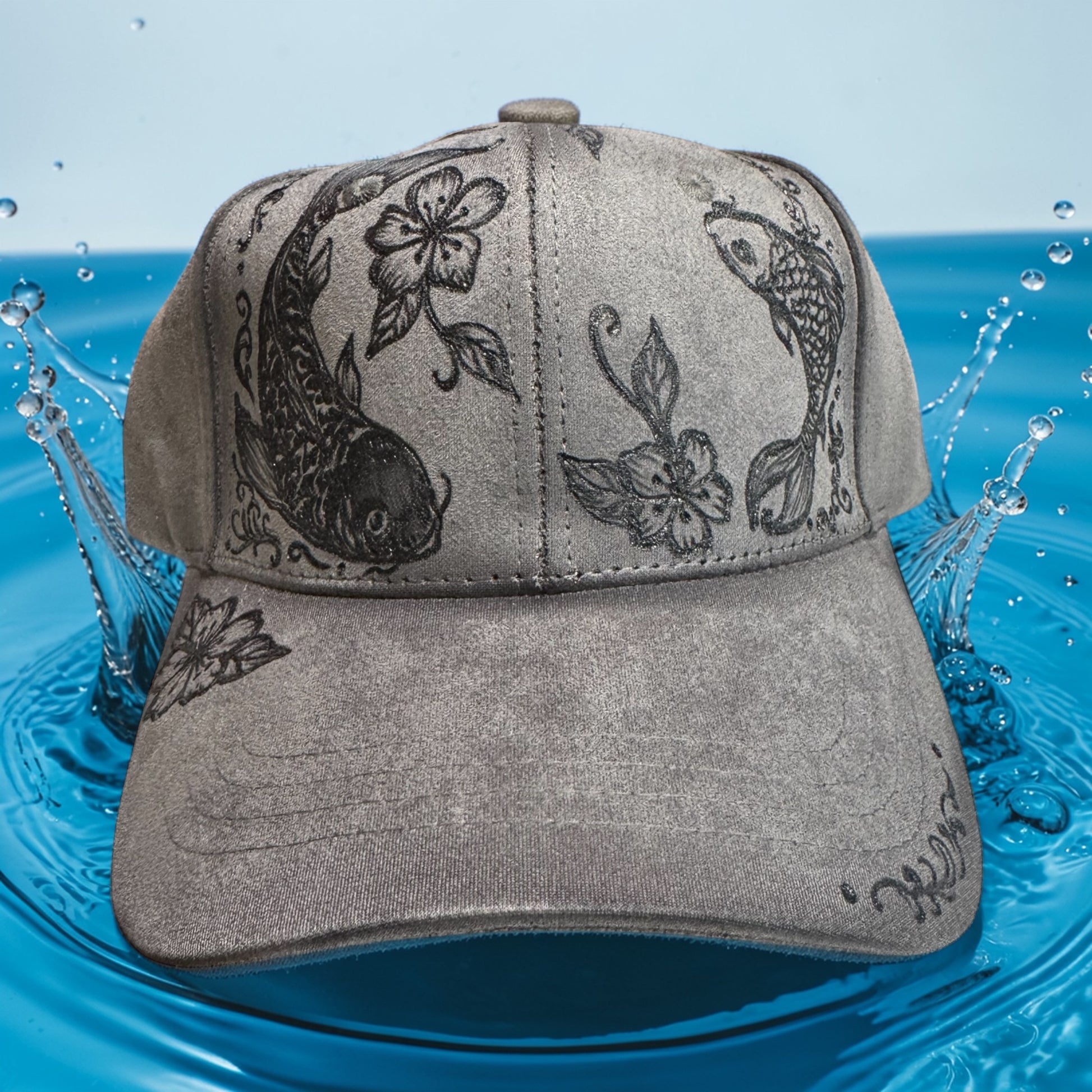 Burned Suede Baseball Style Cap in dark grey. Freehanded art applied using Pyrography techniques. Hat is adjustable. All Hats made by Piper Hat Co. come with a signature bag. Perfect for Travel, Storage or even Gifting.