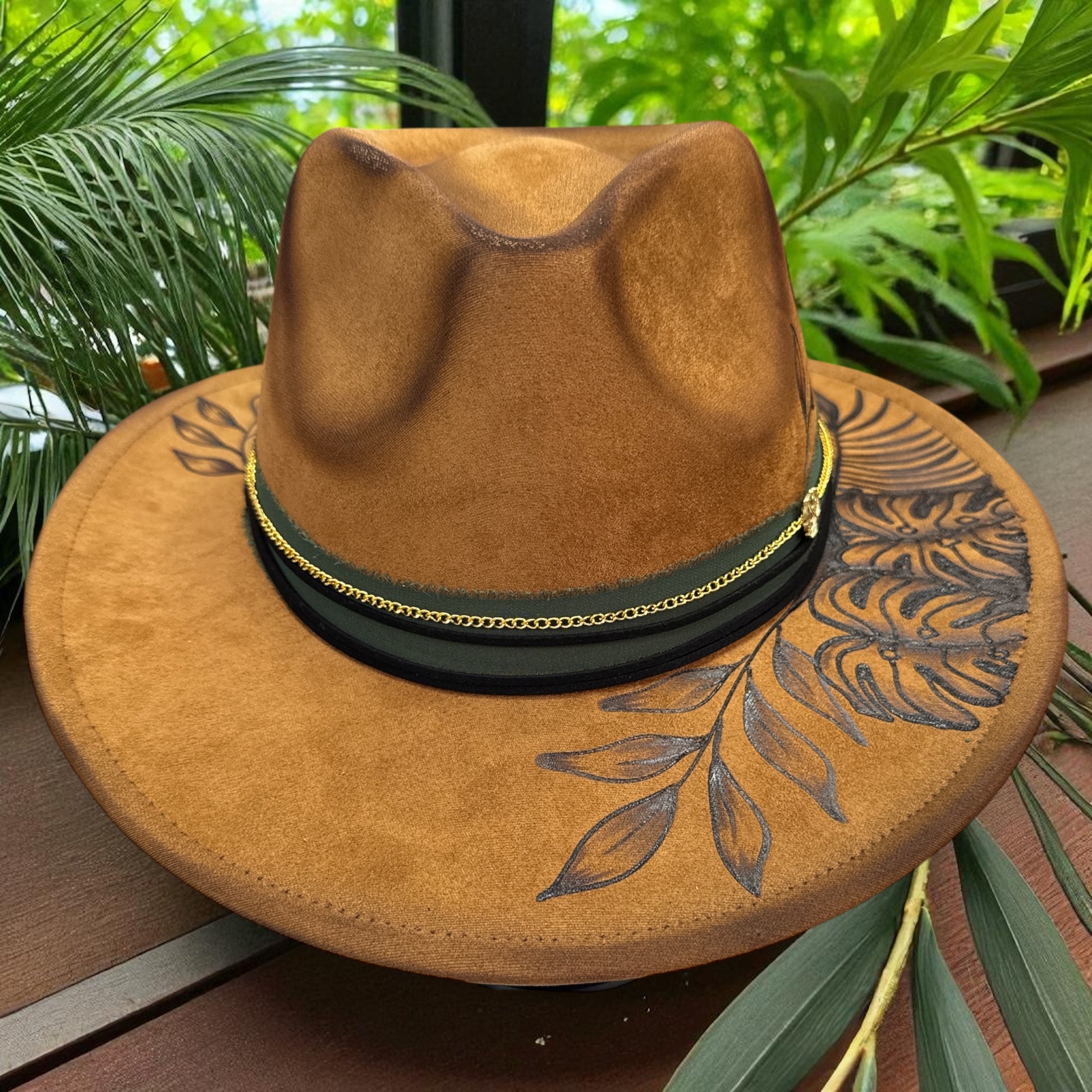 Burned on a Khaki Short Brim Cowboy style Hat with layered bands and pyrography art on the top and under brim. Toasted with a torch for a rugged, used and worn look... fit for the Royals!