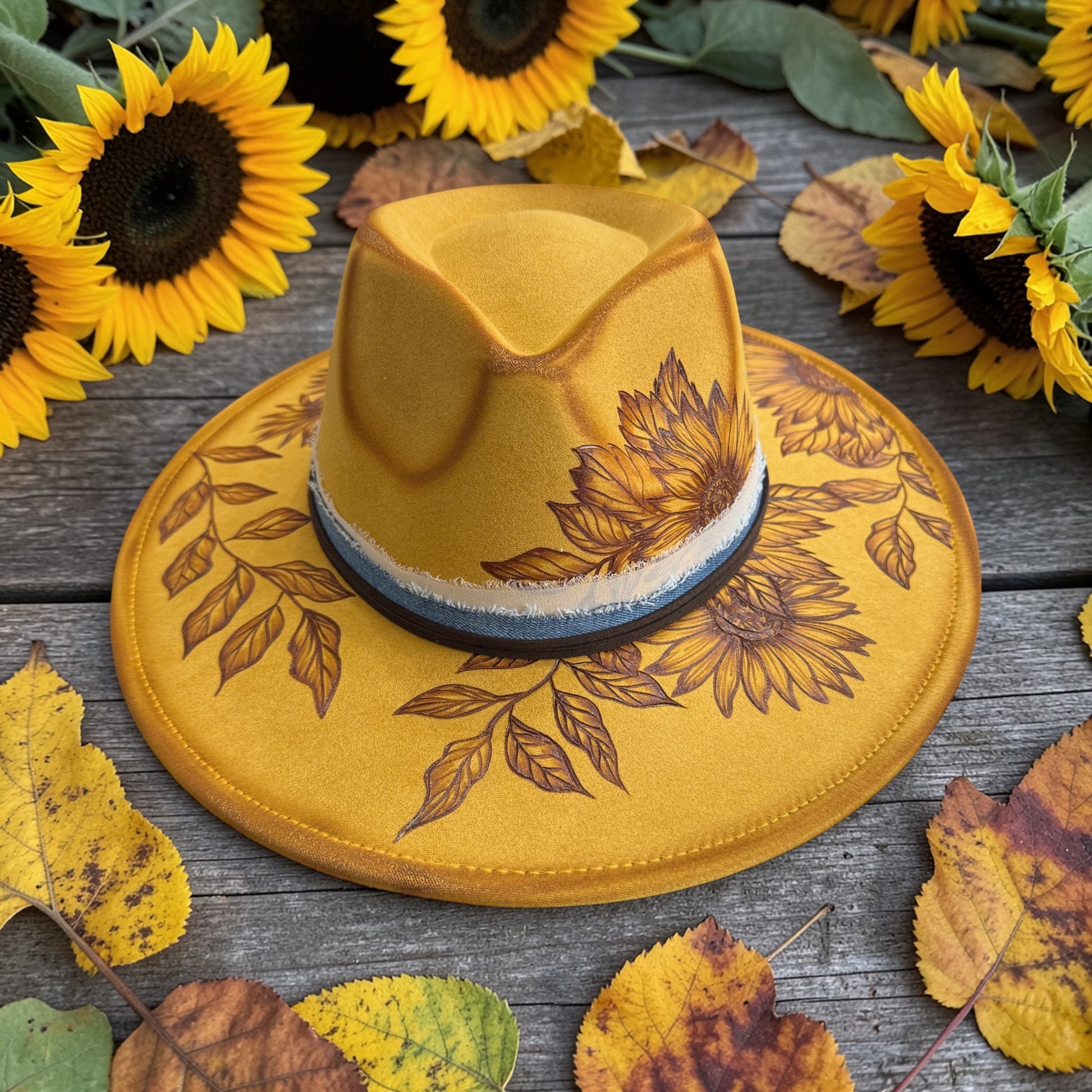 Freehand burned Wide Brim Rancher Hat. Willowleaf, features the named Sunflower(s) around the brim with flowing leaves. Each hat is freehand burned making this a one of a kind.